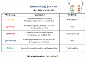Hier sehen Sie den Essensplan der OGS Eickhorst für die Woche vom 26.01.26 bis 30.01.26.