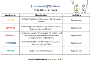 Hier sehen Sie den Essensplan der OGS Eickhorst für die Woche vom 15.12.25 bis 19.12.25.